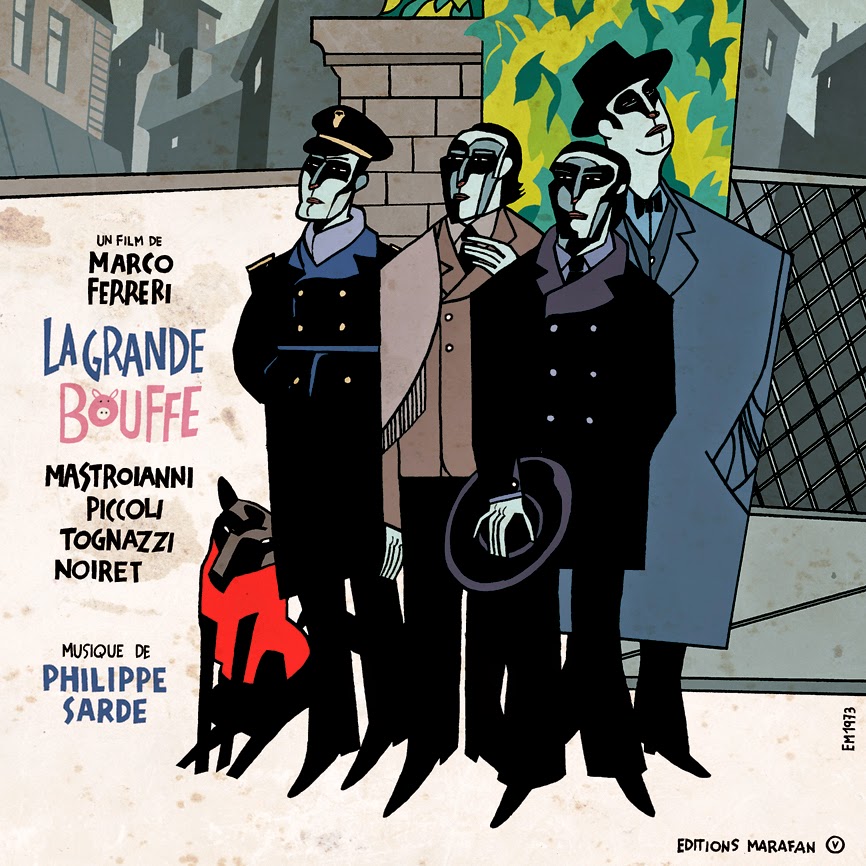 Una ilustración inspirada por la película LA GRANDE BOUFFE de Marco Ferreri. Es parte de un libro colectivo que será publicado próximamente titulado "CoCine Cultura" cuyo tema es "Cocina e Ilustración".